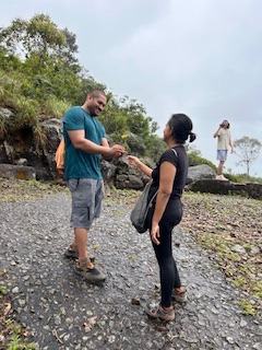 Once the paved part of the path ended, the trail led us into the jungle of the mountainside. The ground was wet and muddy, and Aparna and I both immediately stepped in puddles large enough to get our socks wet. As we went deeper into the jungle, the path got narrower, with jungle foliage brushing against our legs. At this point, Daniel was regretting his decision to eschew long pants. Etosha, looking at his hiking app, assured us that the muddy jungly part of the path would end soon. Aparna said: “Eto, there better not be leeches here.” I looked down at her feet and immediately saw her fear come true: one small, wriggling black wormlike creature had attached itself to the heel of her left shoe. I alerted her to it, and she was able to kick it off. But then I realized there was a leech on my shoe as well. And Daniel’s. Then more on Aparna’s. We started scraping them off with the bottom of our shoes, flicking them off with our fingers, and dousing the leeches with DEET to try to get them to let go. Etosha was, remarkably, completely leech-free.